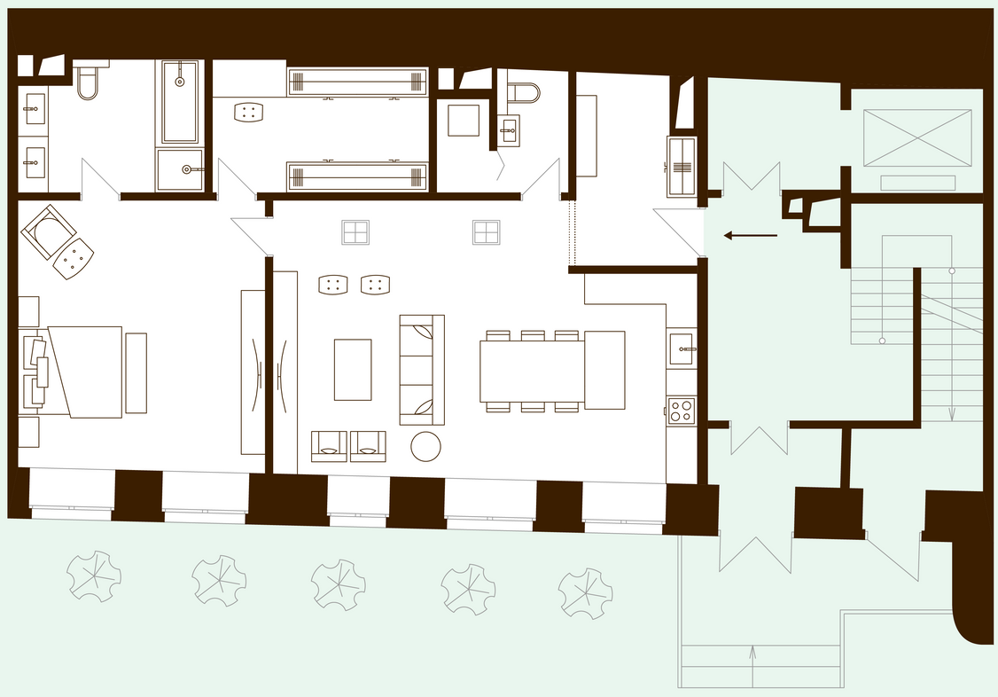 Площадь квартир в ЖК «Меценат» составляет от 83 до 400 м2. В одном доме от 5 до 10 квартир. Типы квартир: